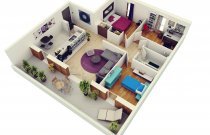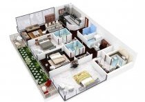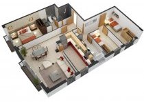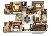 Working with a small space than some of the other designs in this round up, this three bedroom apartment still has all the trappings of a comfortable, modern home. A Jack and Jill bathroom makes a perfect option for siblings with the master bedroom has it’s own bath and walk-in closet. The kitchen includes a breakfast bar as well as a dining area.