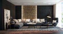 This stunning living room from Dzhemesyuk Design pairs dark woods and matte black walls with a stripe of dazzling gold.
