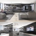 This living room concept centers on a unique backlit wall system, as visualized by Who Cares?! Design. Dark panels embrace the full range of grayscale tones as they flow across the wall in continuous lines. The leftmost portion is more jagged and mountainous, with plenty of room for books and decoration. Several of the panels contain hidden drawers. A large sectional sofa set also addresses the library and television portions separately.