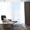 Dramatic black curtains line each side of the fully windowed wall to the left and very likely transform the entire room when drawn.