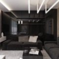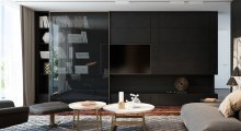 Mitaka Dimov designed this dark apartment living room around an uplifting message, “Stay Positive”. A variety of materials are layered for richness and depth, enhancing the sense of contrast created by the black and white color theme.