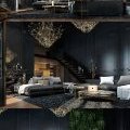 Dark, mysterious, and luxurious – this living room embraces its high ceilings with tall boiserie dressed down with textural black paint. Excellent chandeliers offer soft mood lighting but perhaps most striking of all, a waterfall of ferns cascade down a portion of the wall near the foot of the stairs.